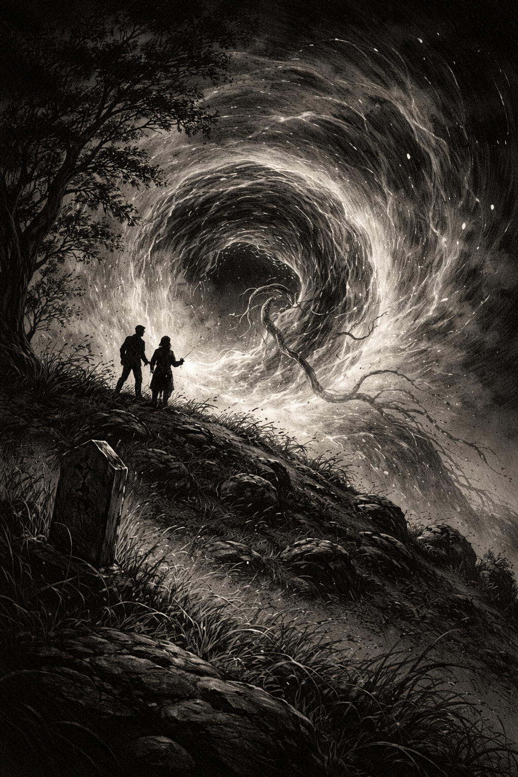 Two strange phenomena happen on a hill above the graveyard. The first a disturbance that appears and then disappears during the night, almost like a gate. Objects passing through the disturbance returned altered in subtle but unsettling ways. The second, a presence of something large and difficult to comprehend that comes closer the more the opening is disturbed.